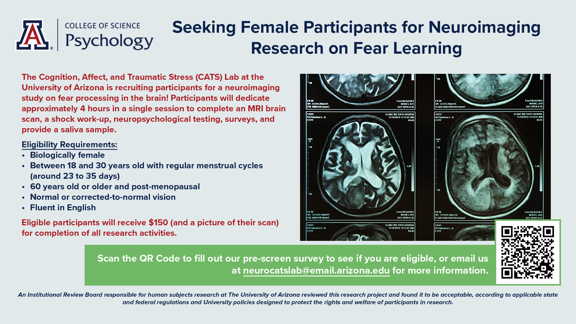 The Cognition, Affect, and Traumatic Stress (CATS) Lab at the University of Arizona is recruiting participants for a neuroimaging study on fear processing in the brain! The PI of this study is Dr. Ashley Huggins in the Department of Psychology.